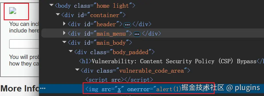 <script src='" . $_POST['include'] . "'></script>接受用户输入的来自域名白名单的js脚本并执行,而这个页面是可以插入任意html代码的,但由于CSP,代码无法执行