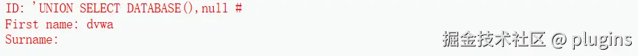 测试UNION查询 查询数据库 'UNION SELECT DATABASE(),null #(null的作用是占据一个回显位置,避免报错,使用UNION时两个SELECT语句的列数必须相同,对应列的数据类型必须兼容)