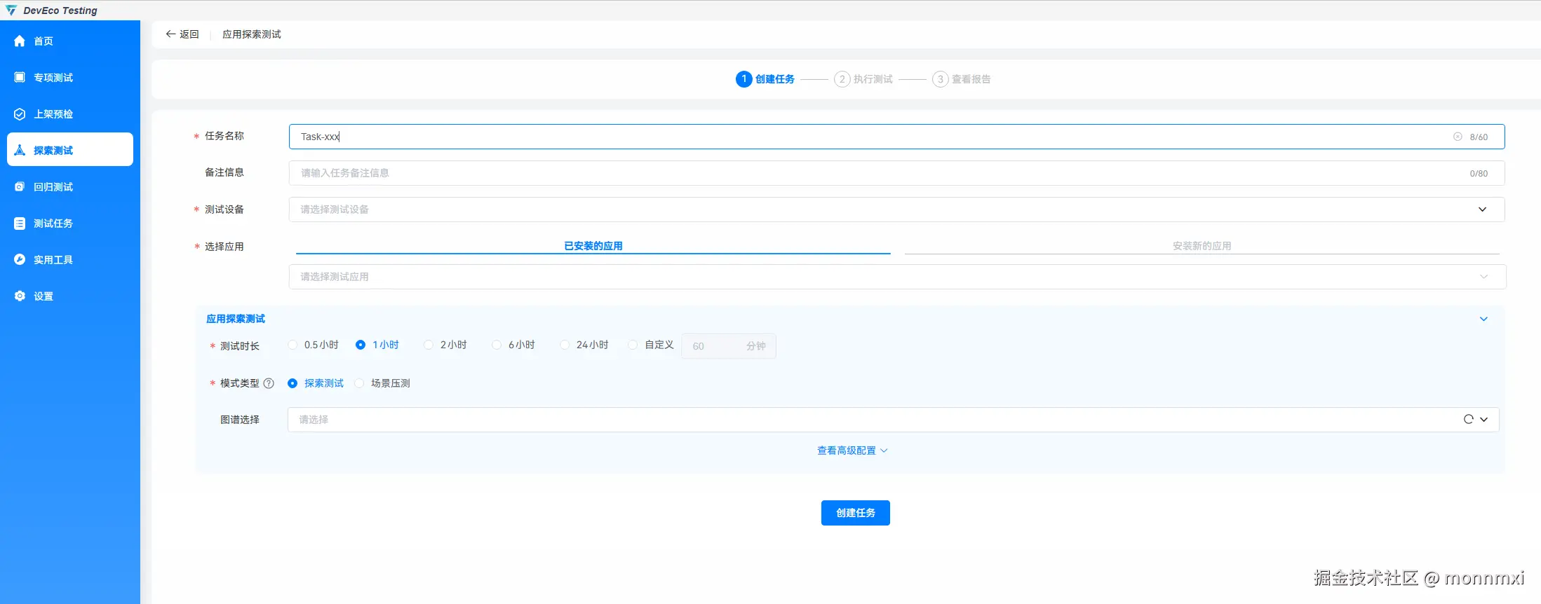 想要实现探索测试功能,只需要连接开发者模式的鸿蒙系统手机,开启USB调试后,在探索测试-应用探索测试对某个APP启动测试即可。