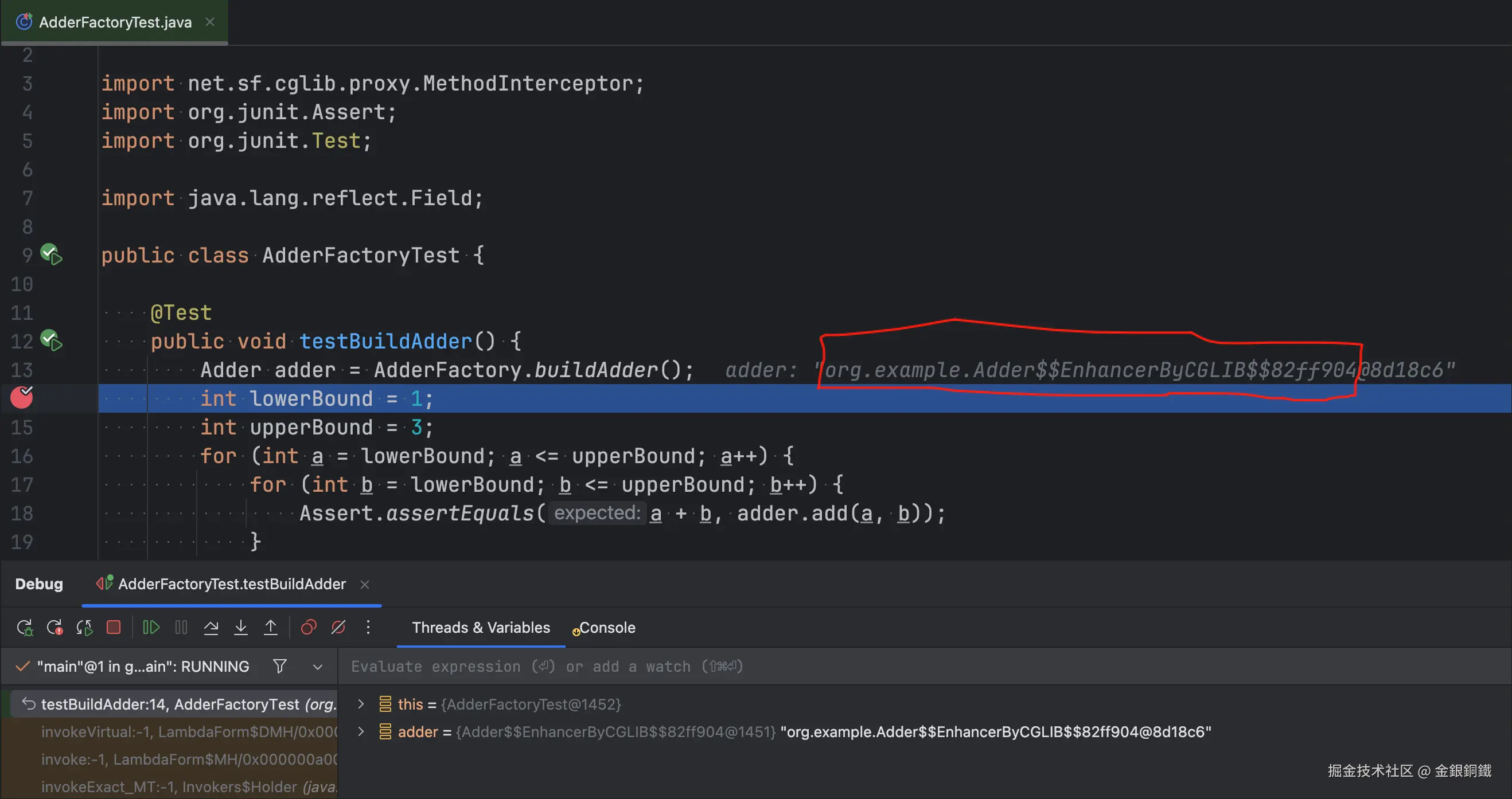 当我们运行 AdderFactoryTest 中的 testBuildAdder 方法时,adder 会是 Adder$$EnhancerByCGLIB$$82ff904 的实例 ⬇️
