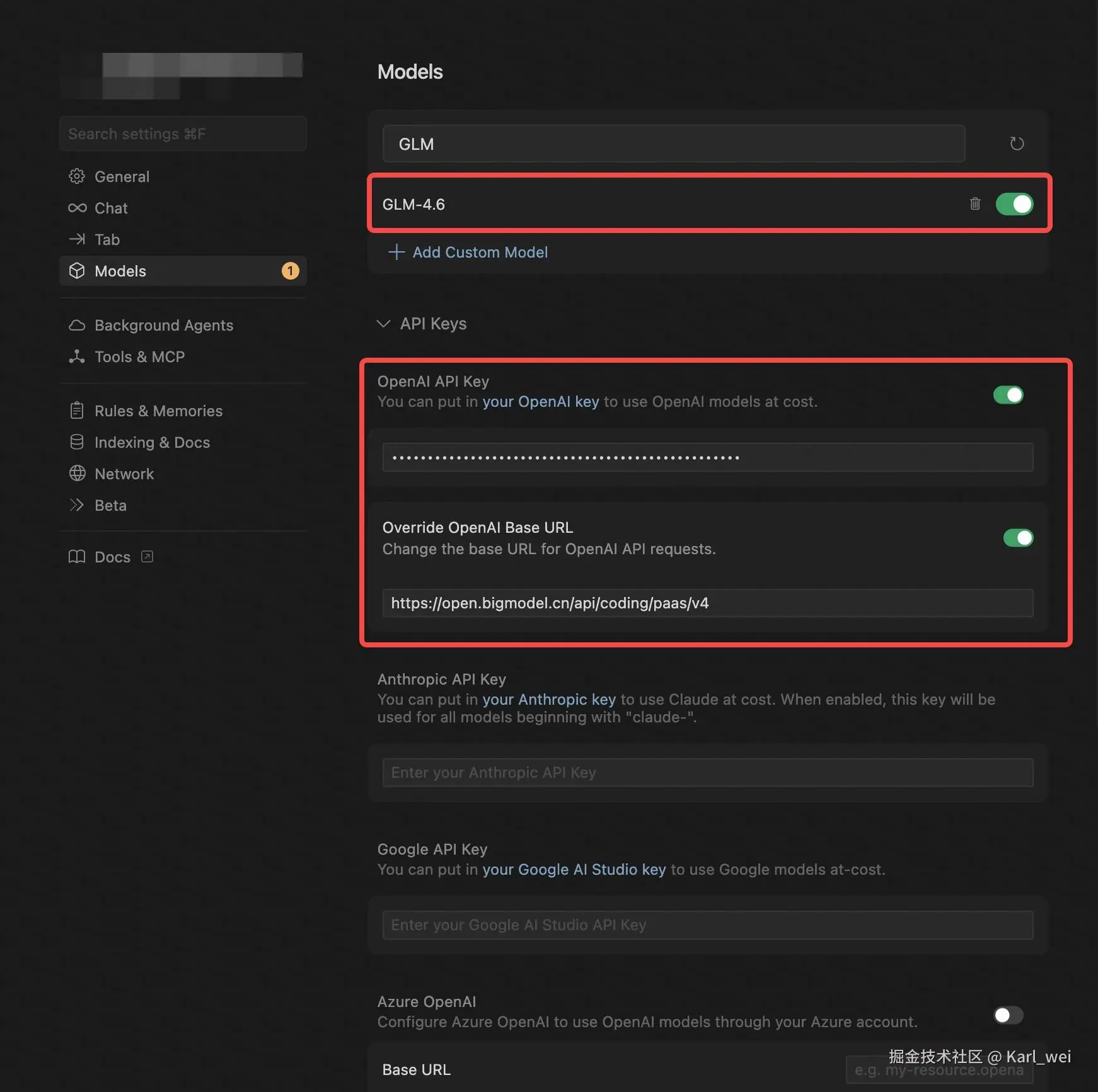 GLM-5,GLM-4.7,GLM-4.6或GLM-4.5-air。 - 注意: 在 Cursor 中,需要输入模型的大写名称不能小写名称,如
