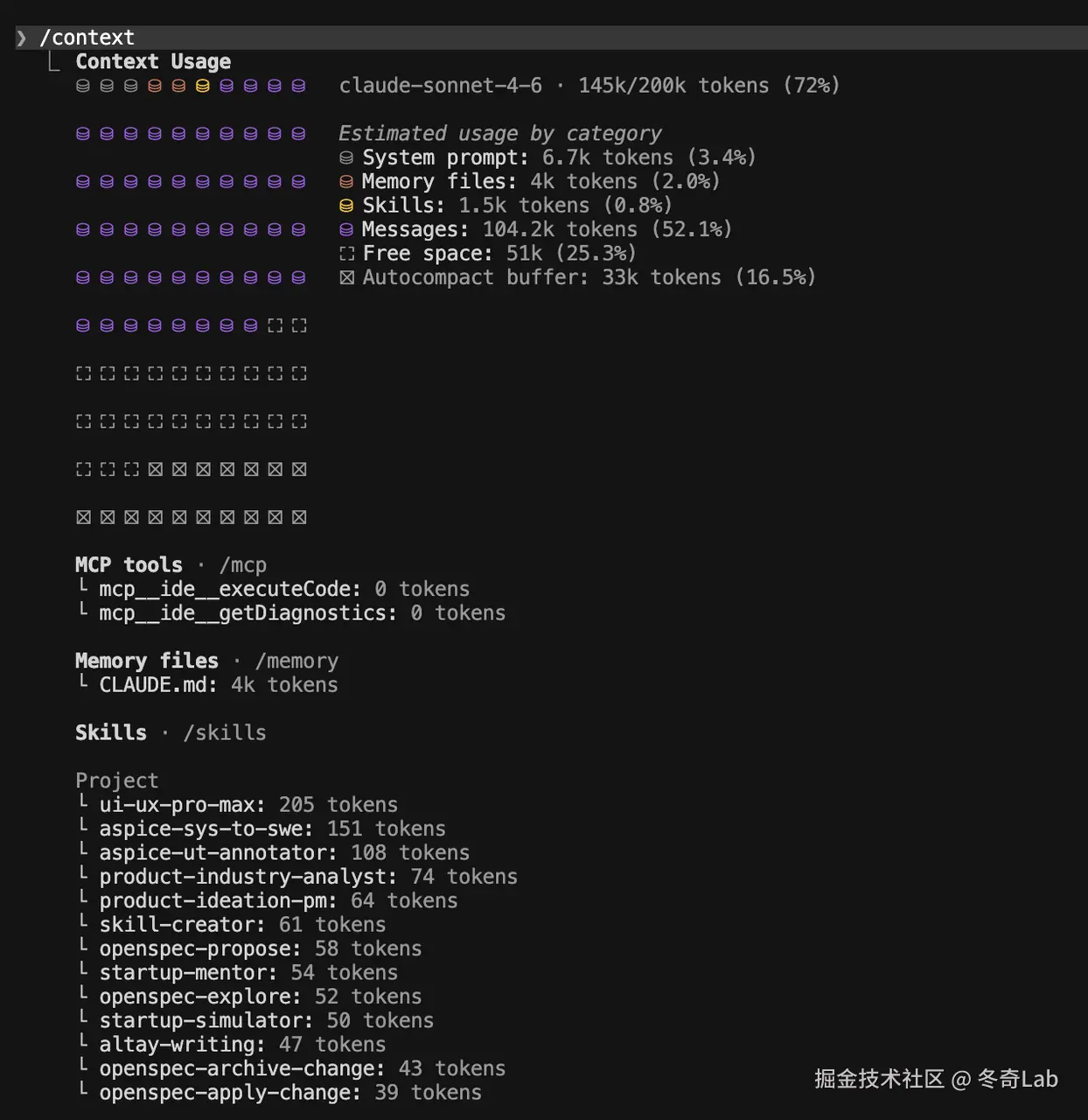 详细展示当前 context 中各部分的 token 占用情况。在 skill 开发、Agent 开发和调试场景中特别有用------帮你找到"context 吃去哪了"。