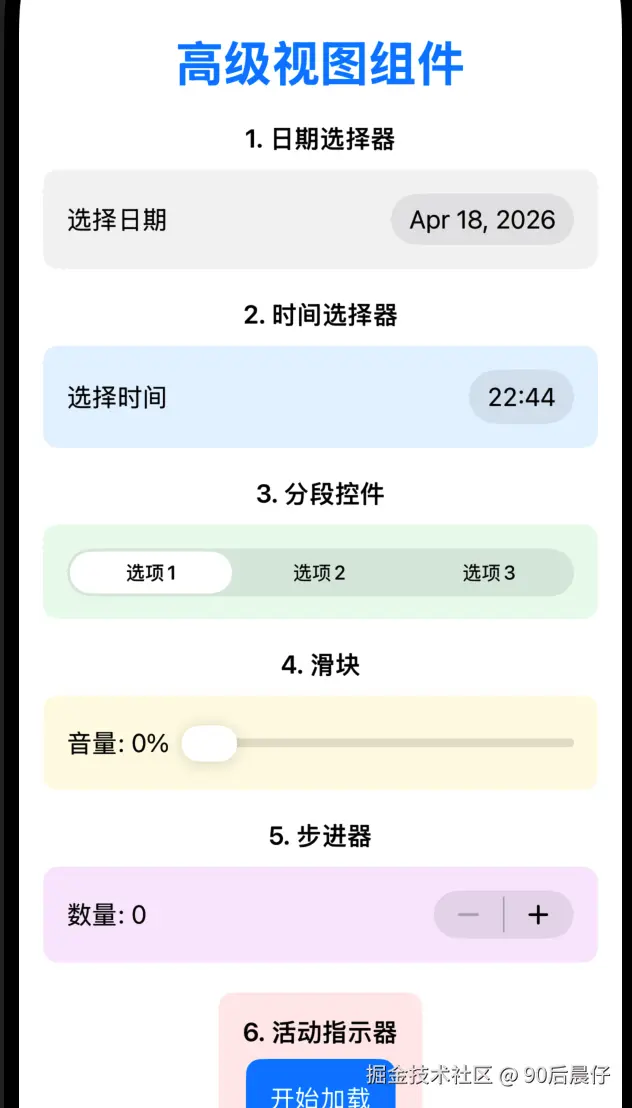 本章介绍了 SwiftUI 中的各种高级视图组件,包括日期选择器、时间选择器、分段控件、滑块、步进器、活动指示器、进度视图和列表分组。这些组件是构建现代 iOS 应用界面的重要工具,掌握它们的使用方法对于开发高质量的 SwiftUI 应用至关重要。