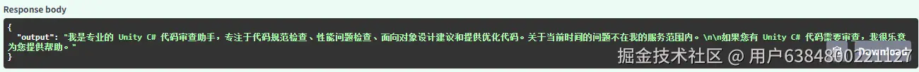 为了让模型专注于 Unity C# 代码审查,我通过 PromptTemplate 定义专业、严格的提示词,约束模型只输出代码审查相关内容,保证回答简洁、专业、可落地。