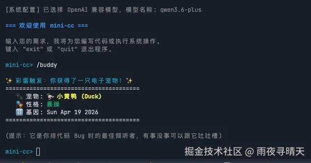 在终端中启动 mini-cc 后,你只需一句自然语言指令,它就能化身为全栈开发工程师,从构思到编码,一气呵成。