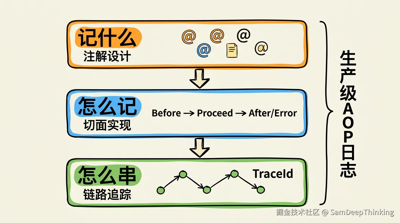 先看全局。生产环境的AOP日志需要解决三个层面的问题:
