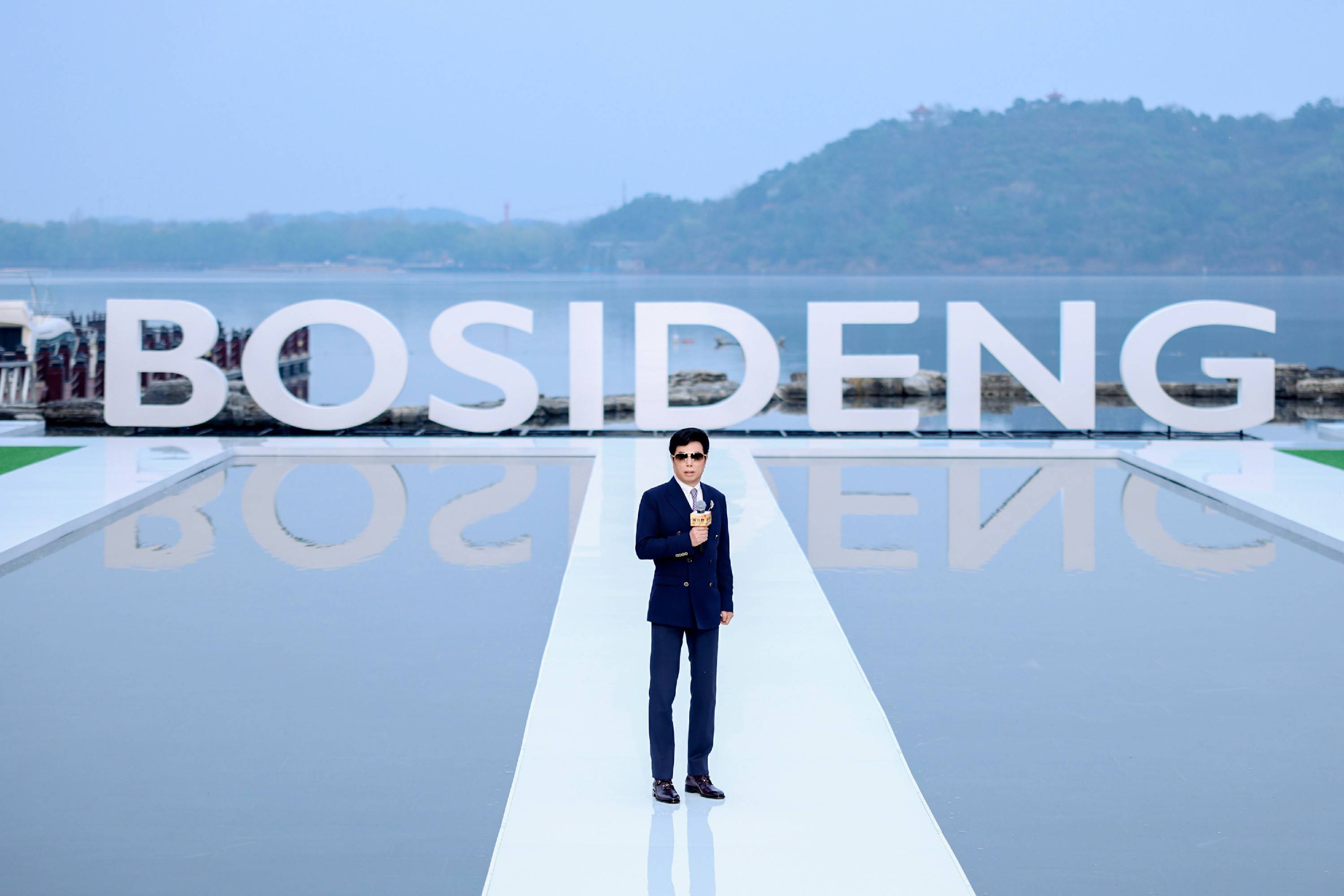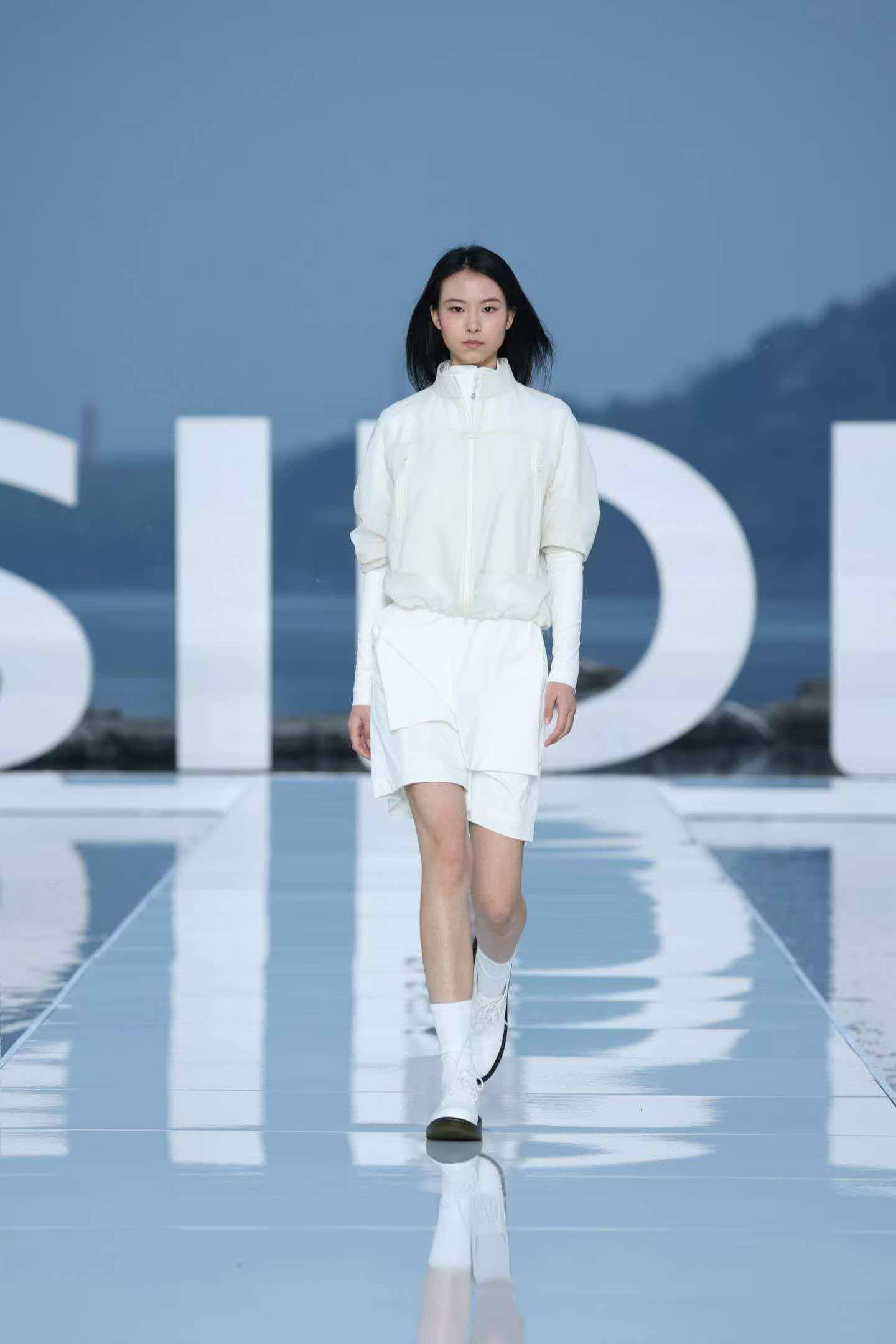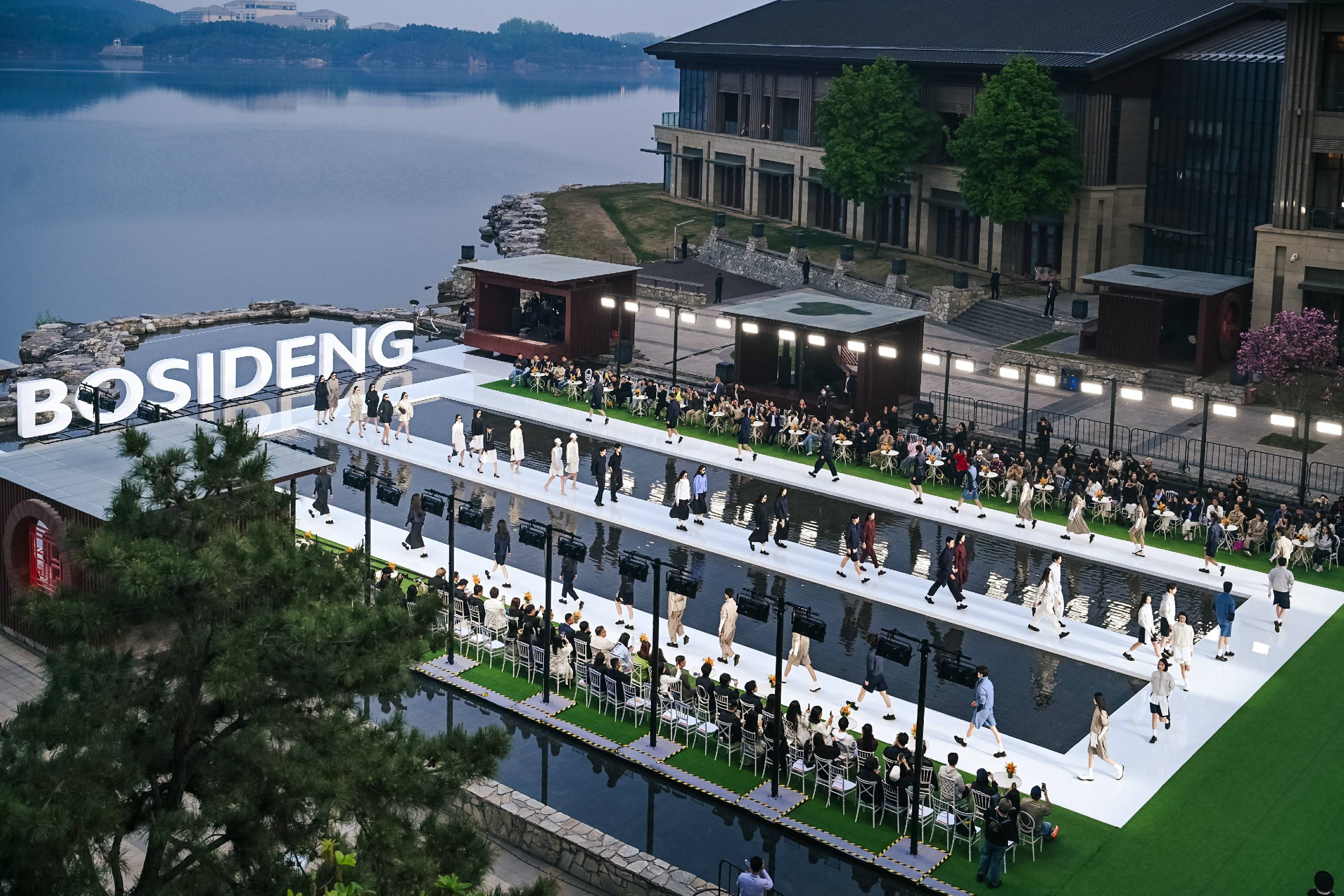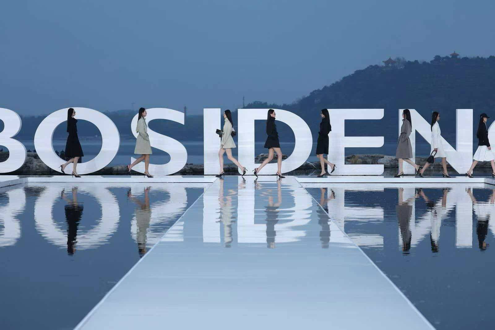 大秀选址雁栖湖畔,湖面波光、远山肌理、落日余晖与舞台背景浑然天成,将波司登本季产品"都市与户外无界切换"的理念化为沉浸式的感官体验。