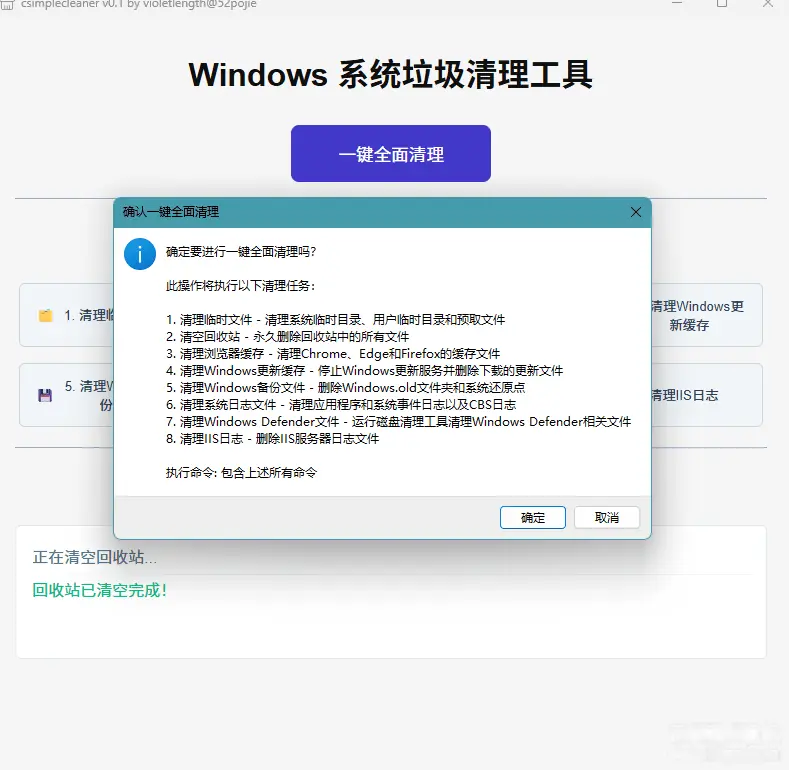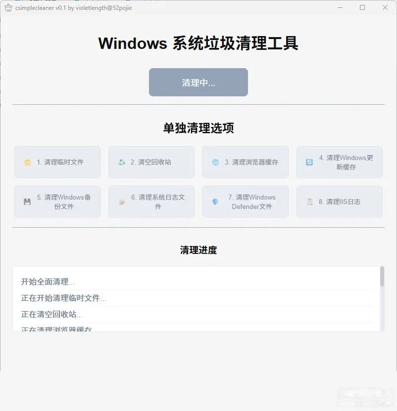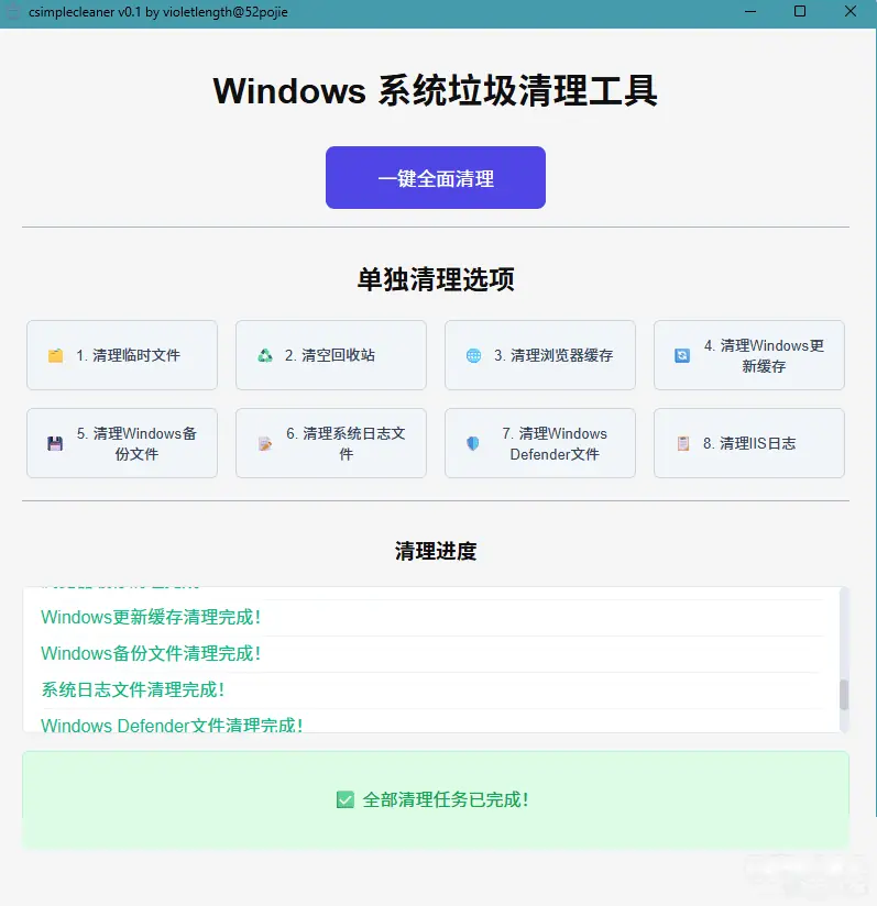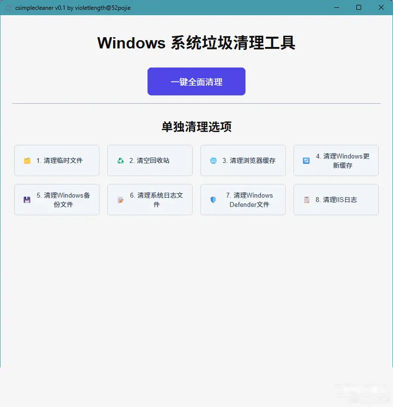 这是一款开源的 Windows 桌面清理工具,使用 Rust + Vue 3 + Tauri v2 构建,界面现代化,支持图形化操作,无需命令行基础,小白也能轻松上手。