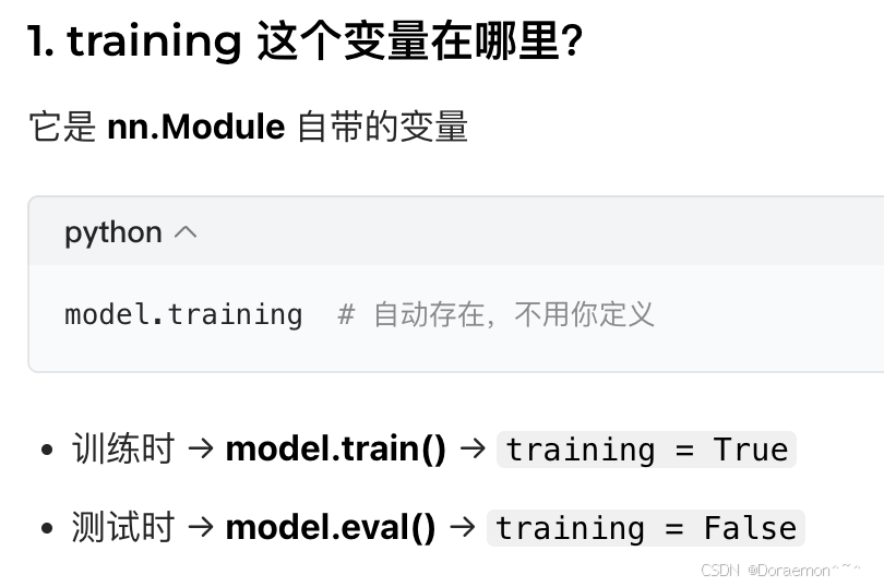 模型处于训练 或评测 模式。对于有的神经网络结构(比如Dropout、BatchNorm这两层),在训练 和**推理(测试/评估)**阶段的行为不同,需要加以区分。