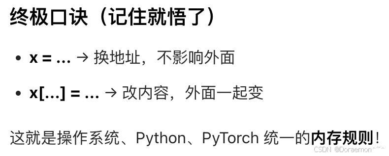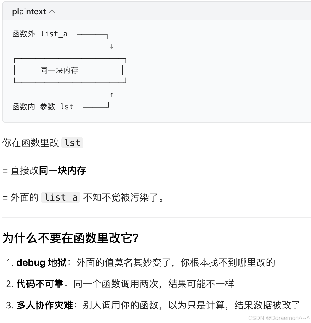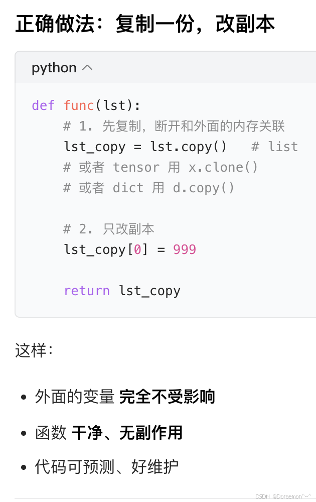 复杂类型(list、dict、tensor、numpy array)传参时,传的是「内存地址引用」,在函数里改它,外面的变量会一起变,这叫隐形副作用(side effect)。