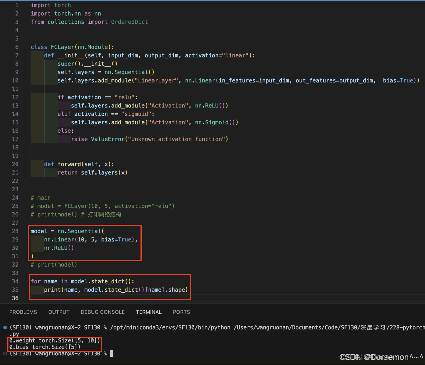 python# 导入PyTorch核心库 import torch # 导入PyTorch神经网络模块 import torch.nn as nn # 导入有序字典(保证参数顺序不变) from collections import OrderedDict # 定义一个全连接层类,继承自nn.Module(所有PyTorch模型的基类) class FCLayer(nn.Module): # 初始化函数:输入维度、输出维度、激活函数类型 def __init__(self, input_dim, output_dim, activation="linear"): # 调用父类nn.Module的初始化方法 super().__init__() # 创建一个有序的层容器,用于按顺序存放网络层 self.layers = nn.Sequential() # 向容器中添加一个线性层(全连接层) # 层名:LinearLayer,输入维度input_dim,输出维度output_dim,开启偏置项 self.layers.add_module( "LinearLayer", nn.Linear(in_features=input_dim, out_features=output_dim, bias=True) ) # 根据传入的激活函数名称,添加对应的激活层 if activation == "relu": # 添加ReLU激活函数 self.layers.add_module("Activation", nn.ReLU()) elif activation == "sigmoid": # 添加Sigmoid激活函数 self.layers.add_module("Activation", nn.Sigmoid()) elif activation == "linear": # 线性激活=不做任何操作,直接跳过 pass else: # 传入不支持的激活函数时,抛出异常 raise ValueError("Unknown activation function") # 前向传播函数:定义数据在网络中的流动路径 def forward(self, x): # 将输入x传入层容器,依次经过线性层+激活层,返回输出结果 return self.layers(x) # ==================== 主程序入口 ==================== if __name__ == "__main__": # 1. 创建第一个模型实例:输入10维,输出5维,激活函数用ReLU model = FCLayer(10, 5, activation="relu") # 2. 创建空的有序字典,用于存储模型最优参数 best_model_state_dict = OrderedDict() # 3. 遍历model的所有参数(权重、偏置) for name in model.state_dict(): # 对每个参数进行深拷贝,存入有序字典 # .clone() 保证新参数独立,不与原模型共享内存 best_model_state_dict[name] = model.state_dict()[name].clone() # 4. 创建第二个模型,结构必须和第一个完全一致 model2 = FCLayer(10, 5, activation="relu") # 5. 将拷贝好的参数加载到第二个模型中 # 注意:只加载参数,网络结构由FCLayer类提供 model2.load_state_dict(best_model_state_dict)