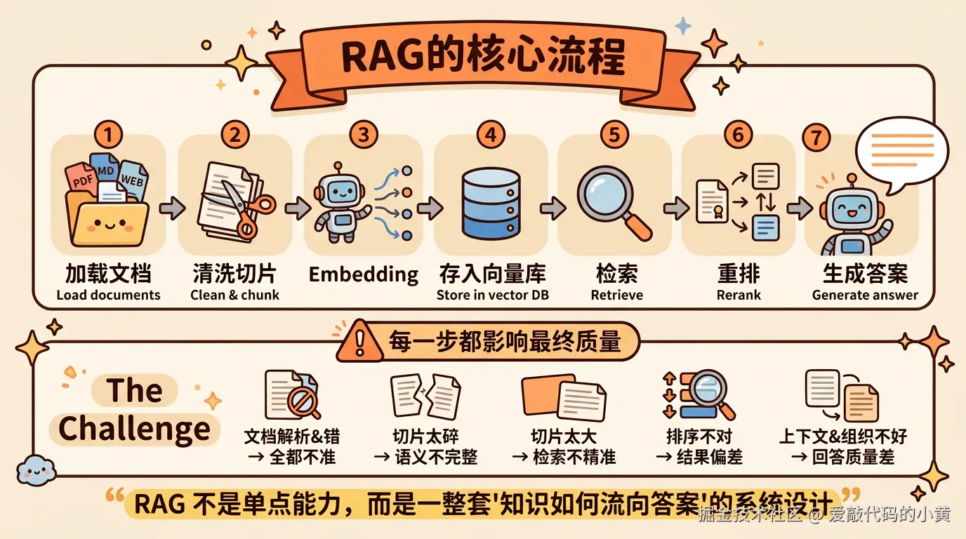 看起来不复杂,但真正难的是:这条链路里,每一步都会影响最终回答质量。