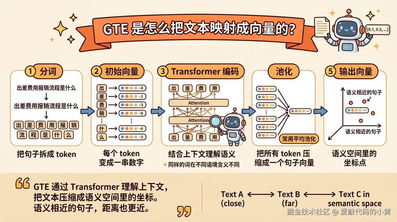 实际工程里,这一类模型常见的代表有 BGE 和 GTE 系列,比如 bge-large-zh、bge-m3,或者 gte-large 等。它们本质上做的都是同一件事:尽量让语义相近的文本,在向量空间里离得更近。