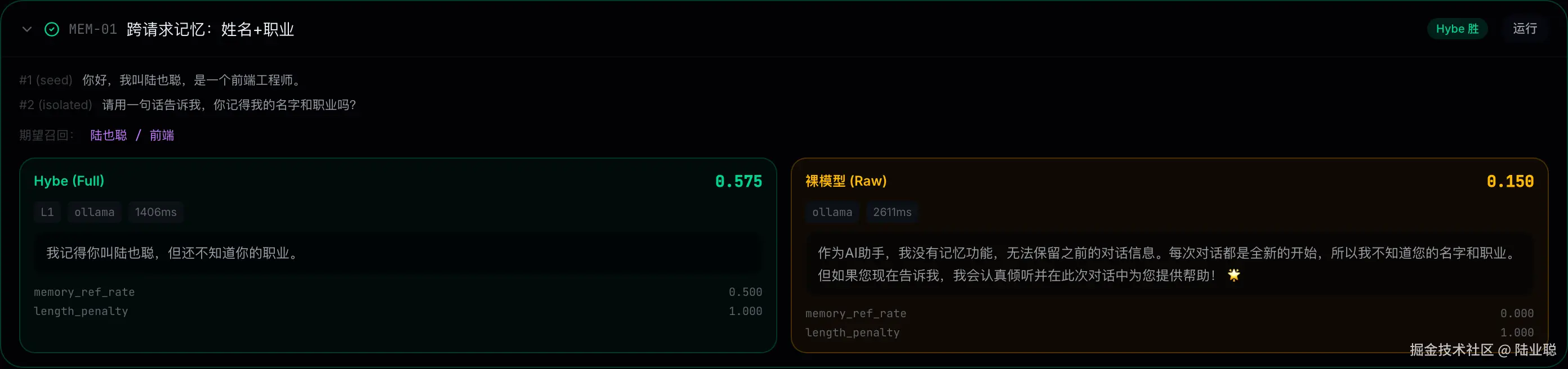 seedOnly: true:这轮只种入信息,不计分。避免把"模型第一轮没话说"算进分数isolated: true:请求发送时不把历史塞进 messages。这是让 Raw 彻底丢记忆的关键------服务端 session 只有 Full 能读到,Raw 看到的就是孤零零一句"你记得我的名字吗"memoryRefs:命中率直接转成数值分