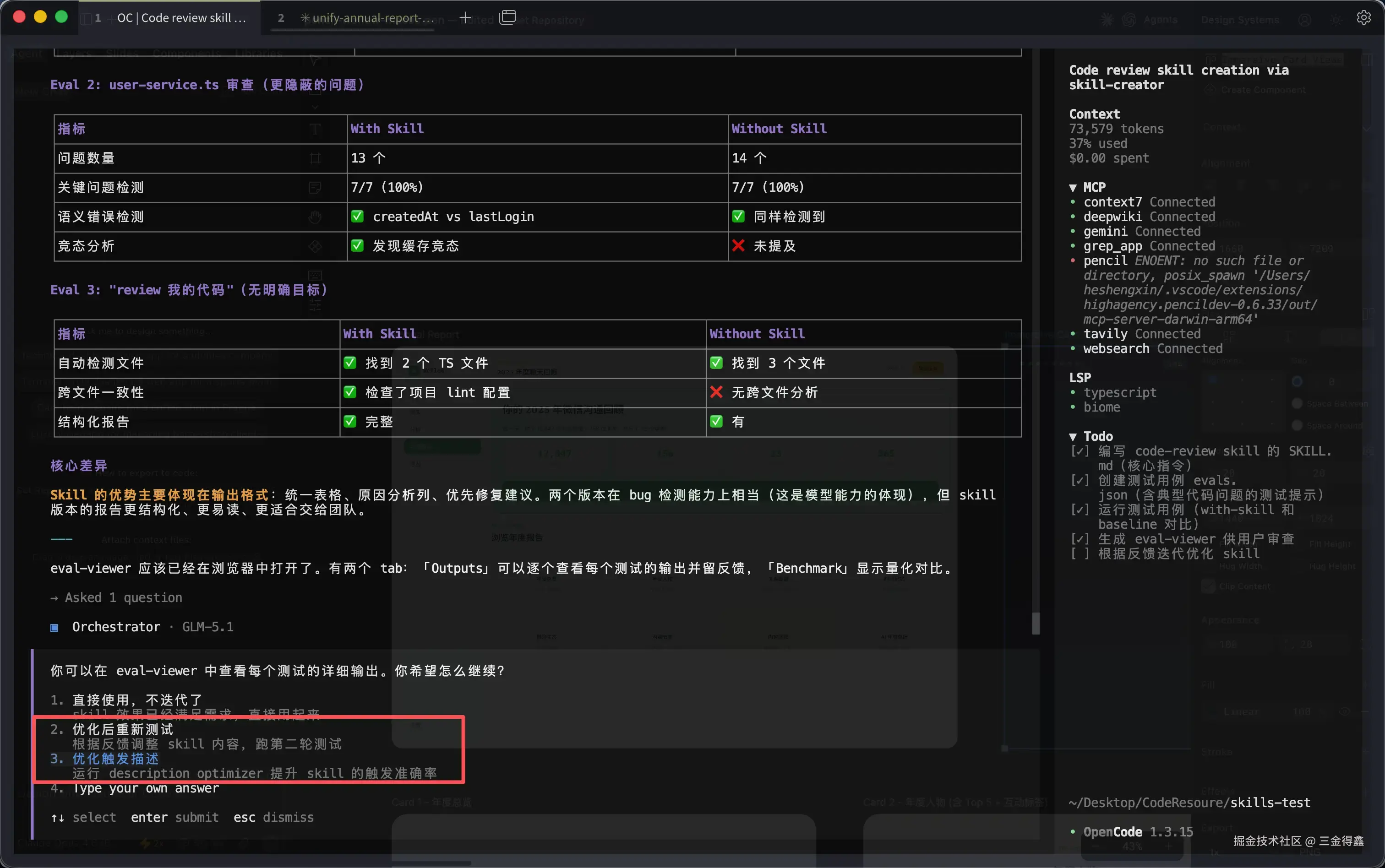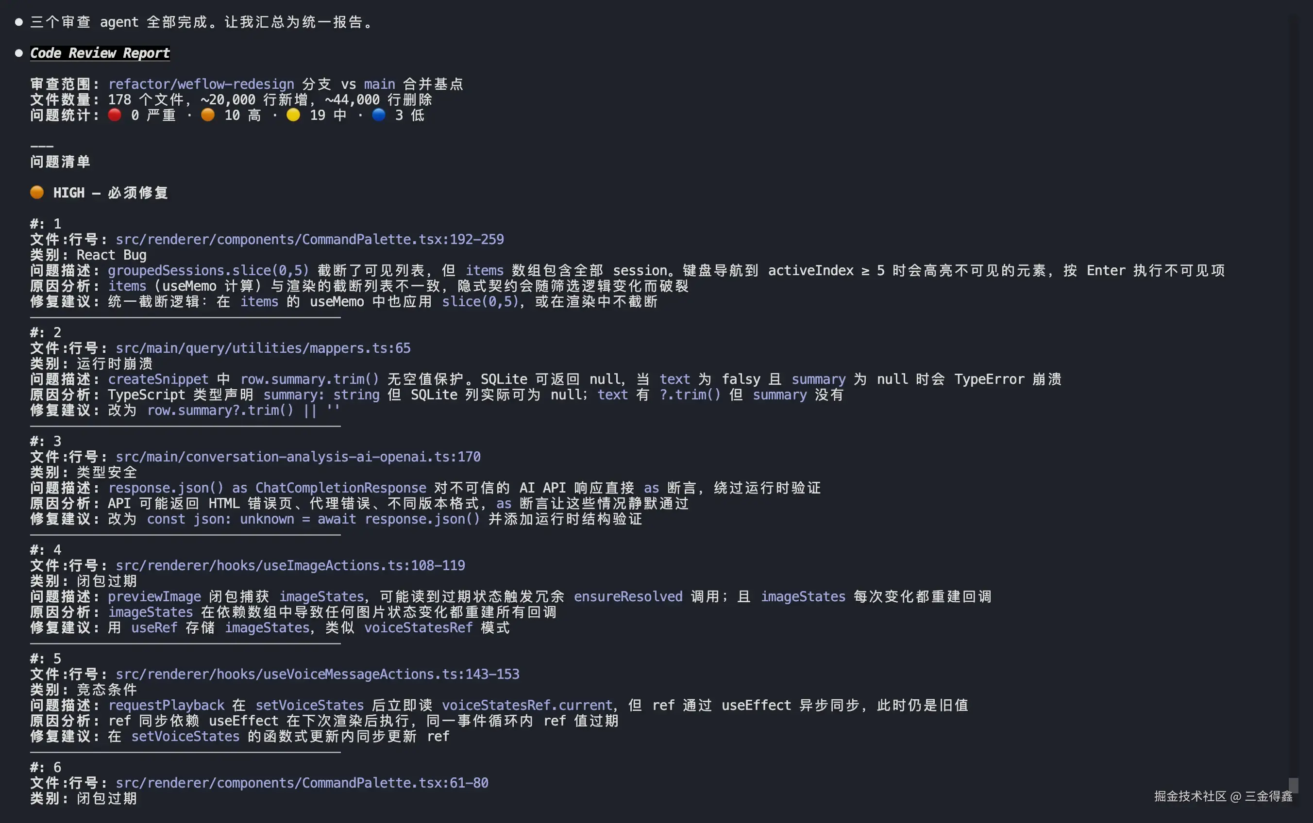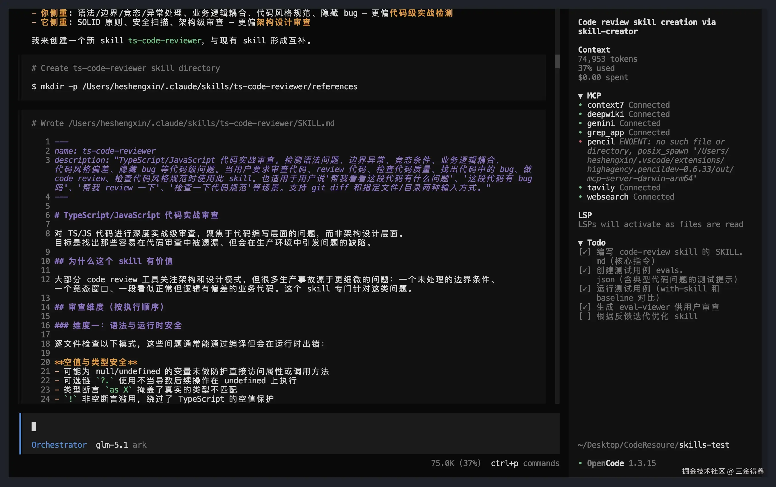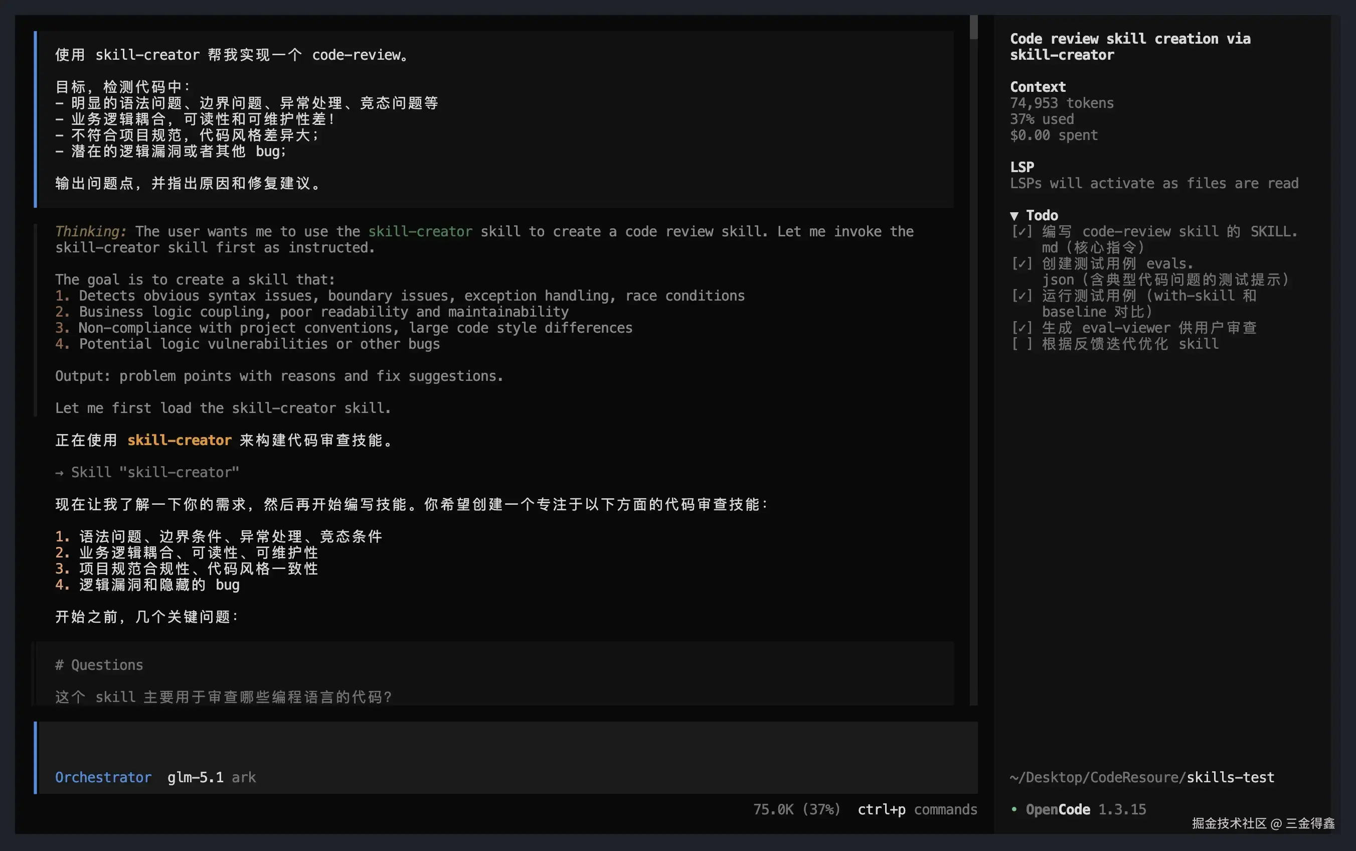 整套创建流程异常丝滑,生成的 skill 在实际测试中也表现出色,可以清晰地指出代码中的缺陷,并按照优先级进行排列: