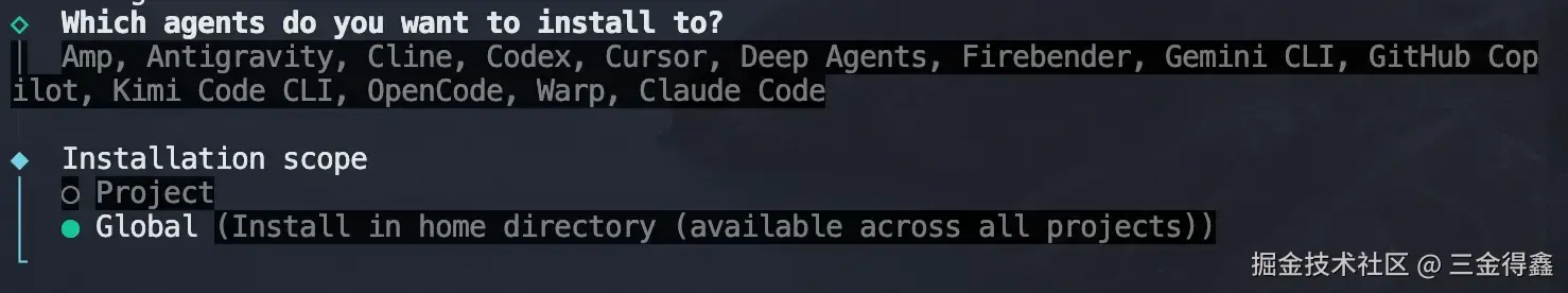 以 Claude Code 为例,空格选中之后回车。接下来选择项目级别的安装还是全局安装: