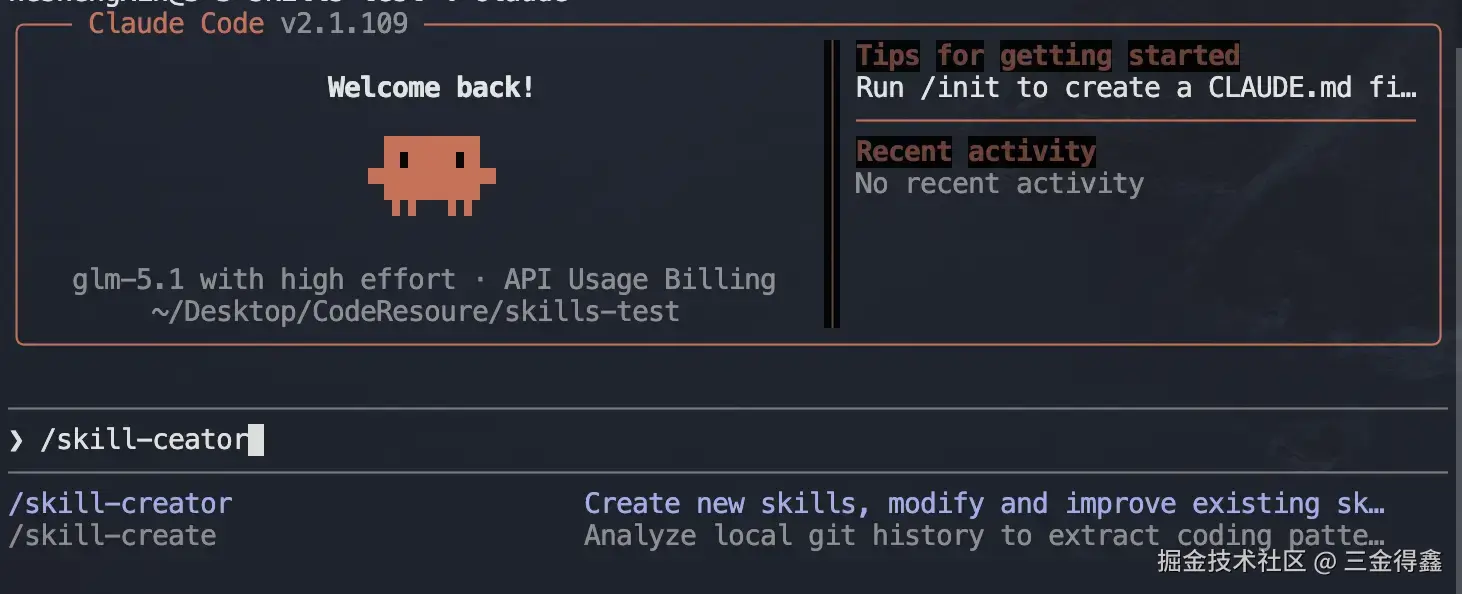继续回车即可。安装好之后打开 Claude Code,输入 /skill-creator 即可看到: