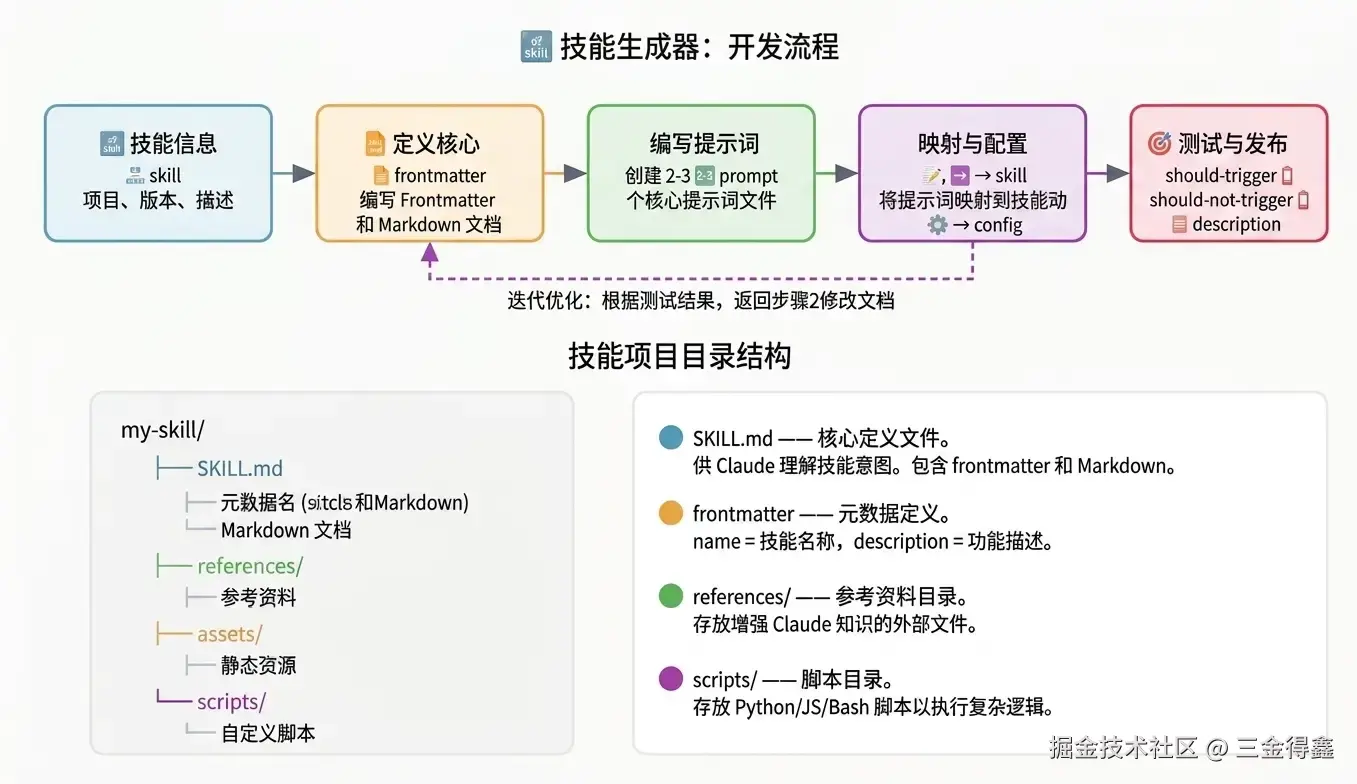第四步:迭代 。衔接上一步,根据验证结果 -> 反馈 -> 优化 skill -> 再测试验证。多轮迭代下来,Skill 的功能会越来越趋近于我们的目标,直到完全吻合。