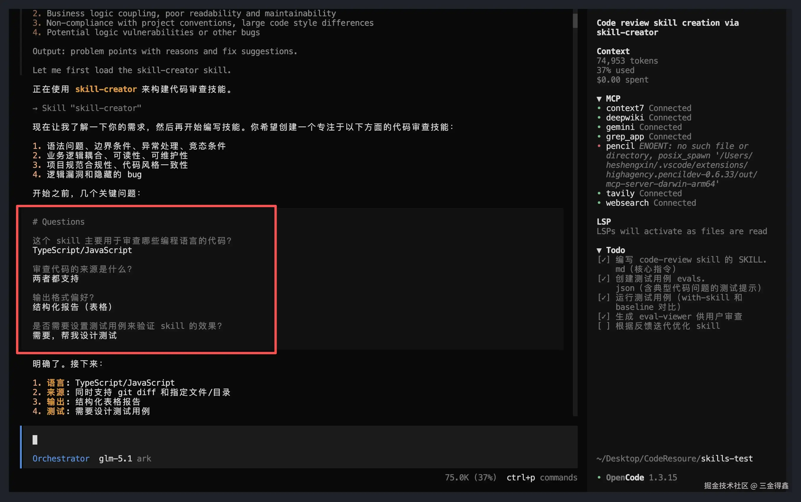 第一步:告诉"我"你的梦想是什么(bushi) 。你需要告诉 skill-creator:我想做一个 Code Review 的 Skill。然后它就会反向追问你几个问题(如上一小节所示的截图),逐渐把模糊想法梳理成清晰的需求。