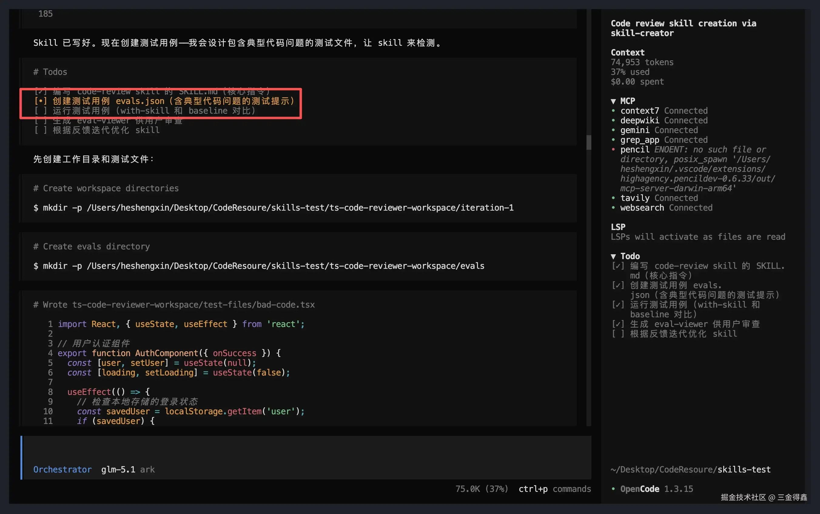第三步:它生成测试 prompt(在 eval.json 中可以看到) 。从这一步开始就是重点,skill-creator 并不是把 Skill 写完就完事儿了,它会帮我们生成几个真实的测试场景去跑,然后再由我们来验证一下生成的这个 Skill 是否真的管用。在 AI + 人工协作时代,我始终认为人工审查验证是必不可少的护城河!