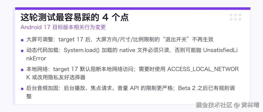 你们团队现在对 Android 17 的适配进度到哪一步了?最难啃的坑是哪一类(大屏、网络、动态加载、后台行为、性能)?欢迎在评论区聊聊,我也会把大家反馈最多的问题整理成下一篇"避坑清单"。