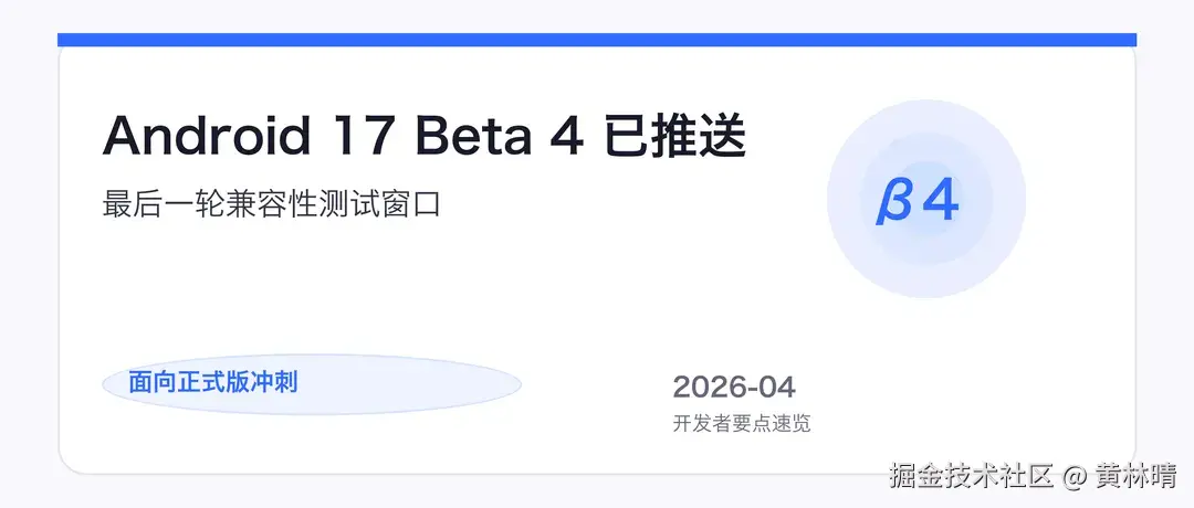 Android 17 Beta 4 已经开始推送了,而且这是本轮发布周期最后一个"计划内 Beta"。
