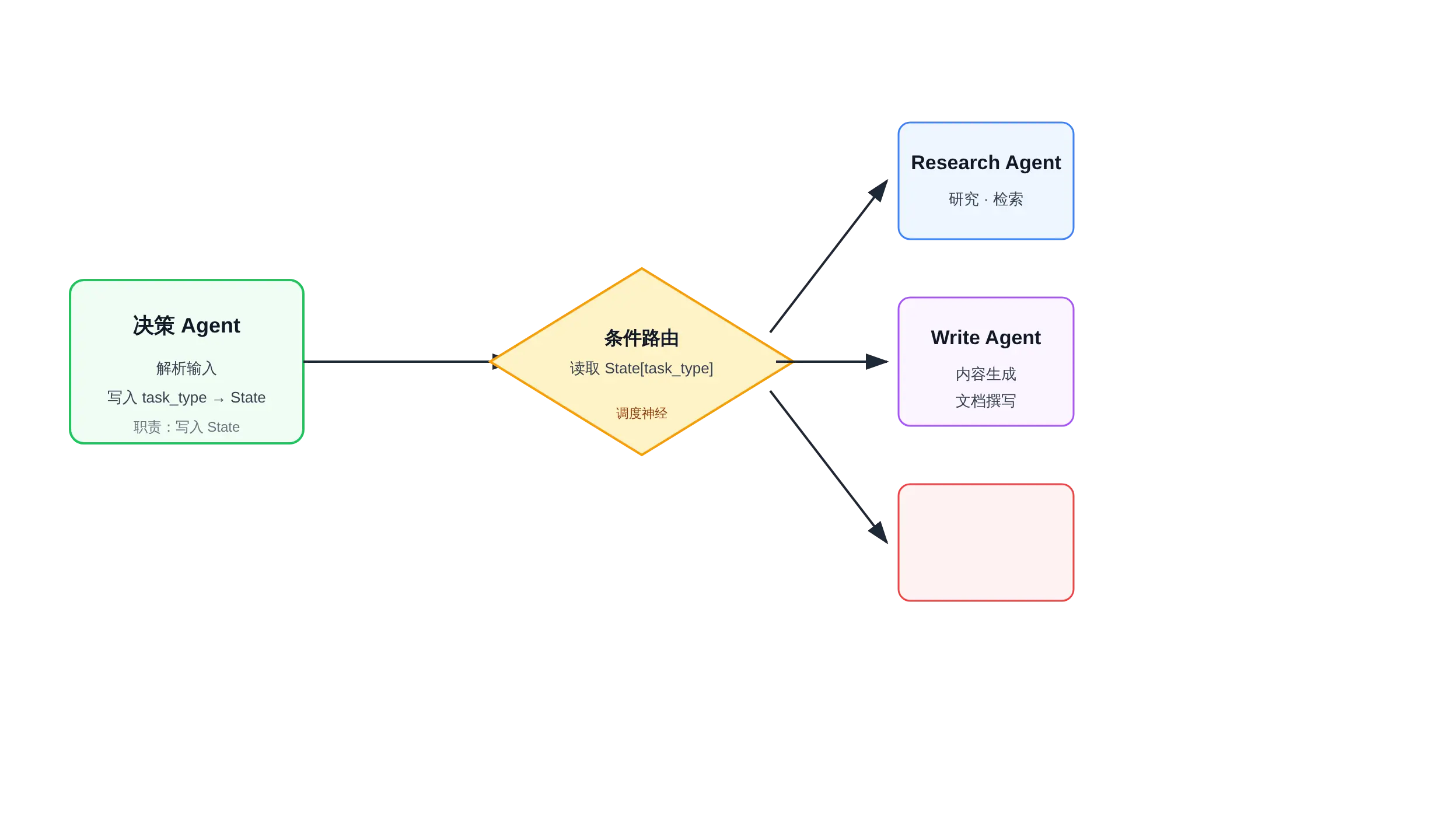 condition 函数在这里读取决策 Agent 写入 State 的任务类型字段,然后路由到不同的执行 Agent: