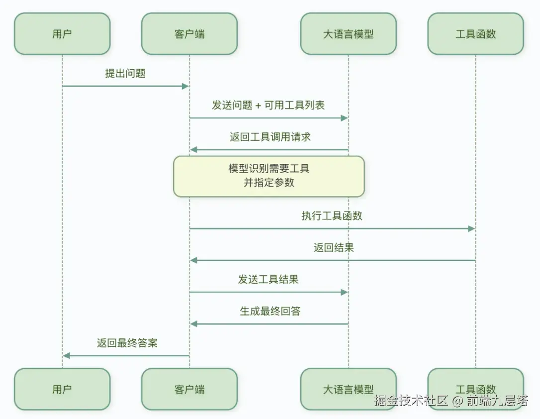 Function Calling 是一种 LLM 调用 Tool 的机制。当 LLM 识别用户需求需要调用 Tool 时,它会生成结构化的函数调用指令,然后由 Agent 执行指定函数并将结果反馈给 LLM,最后 LLM 基于结果进行下一步操作。