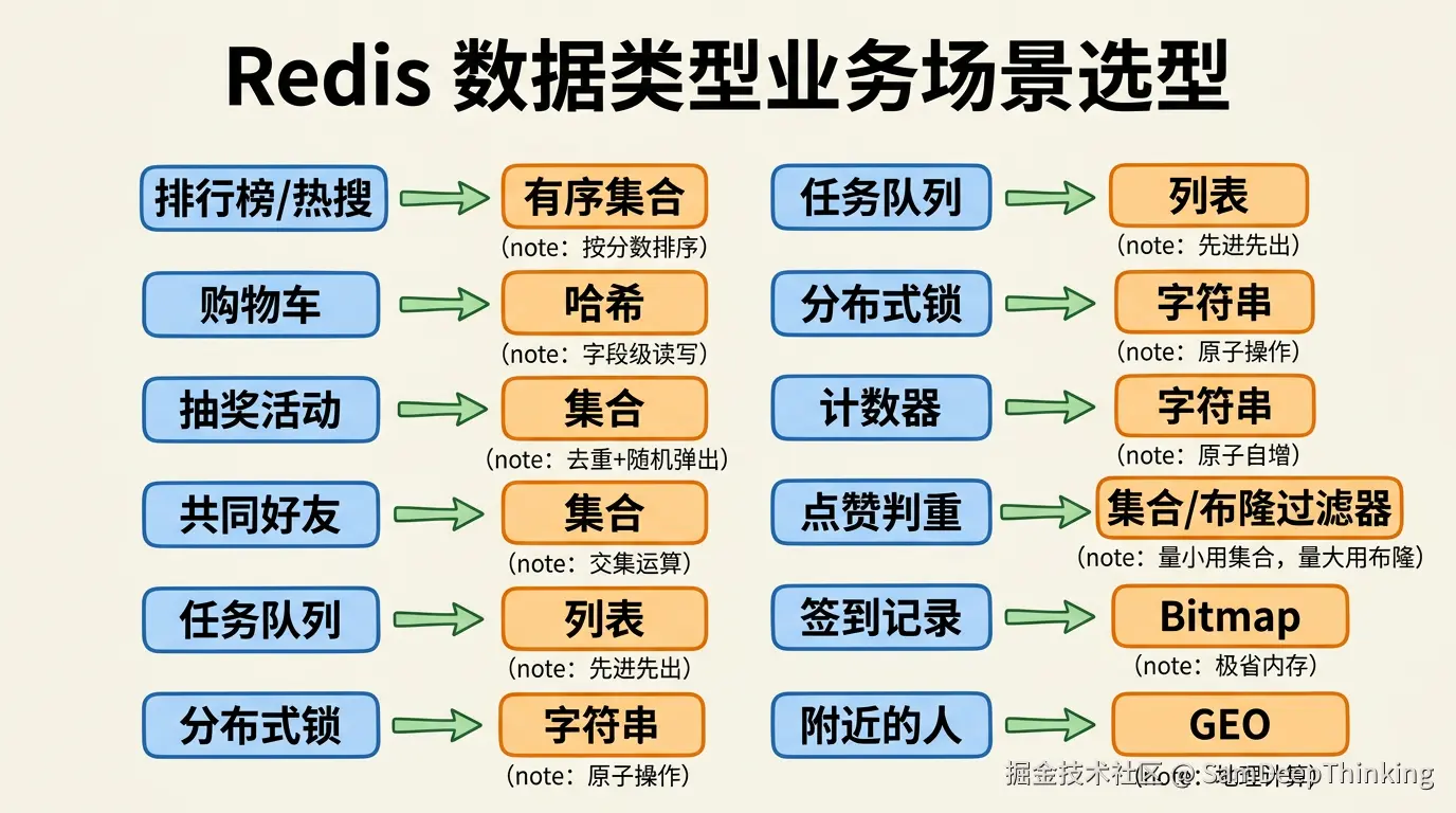 下面这张表整理了Redis常见的业务场景和推荐的数据类型选择,做技术方案的时候可以直接对照: