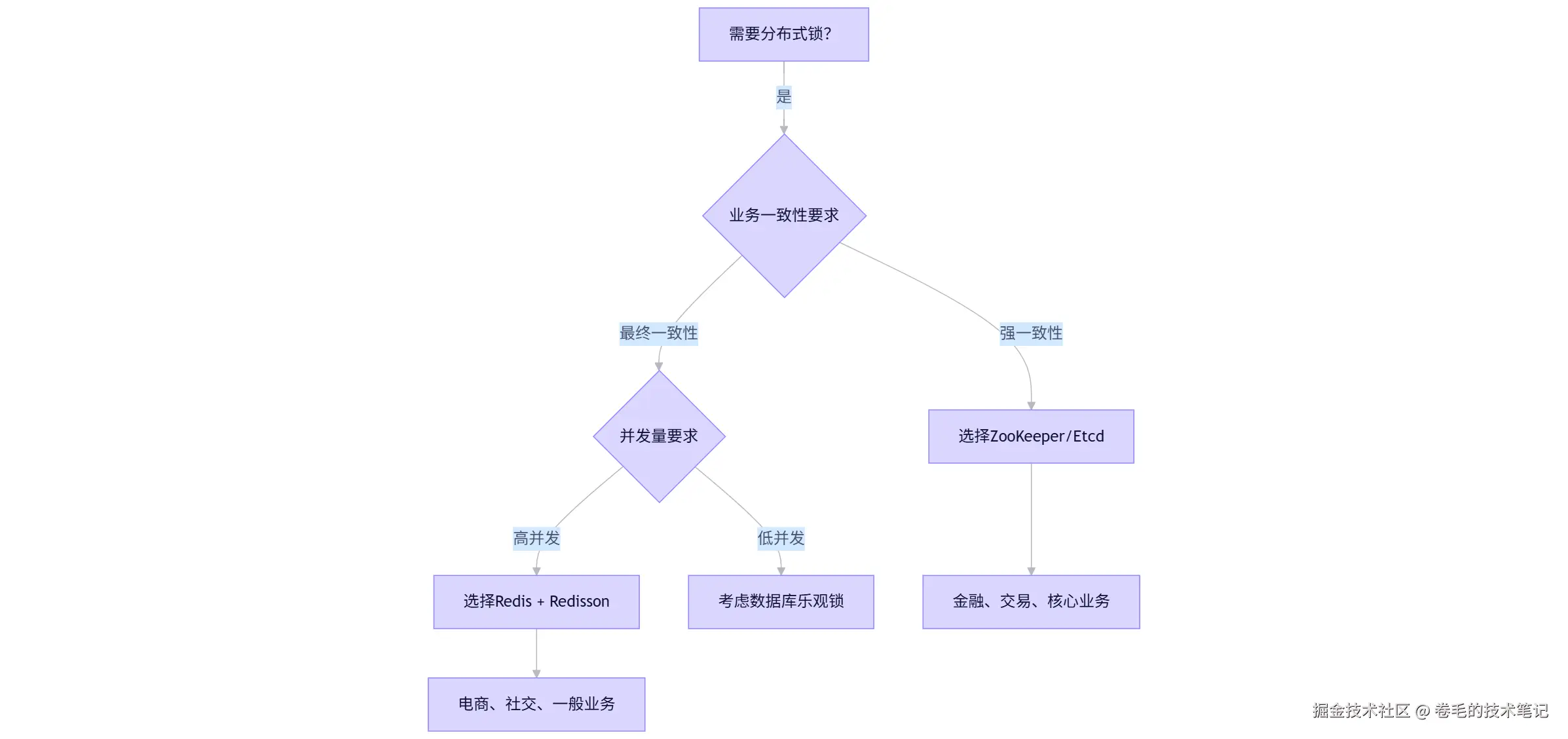 | ZooKeeper方案 | 临时顺序节点 + Watch机制 | 强一致性,无死锁风险,天然公平 | 性能相对较低,运维成本高 | 金融级、强一致性要求场景 |