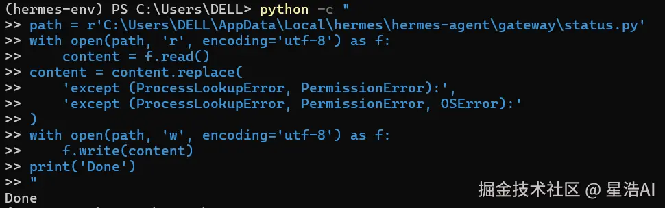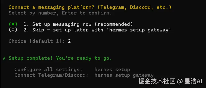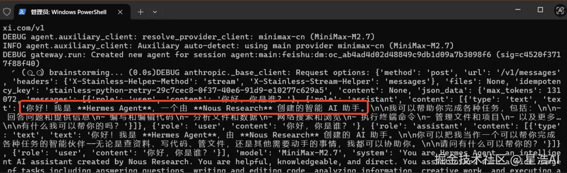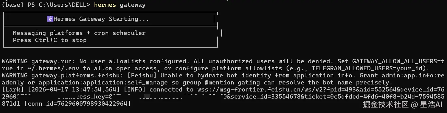 再次执行hermes gateway,启动成功。