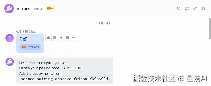 飞书向机器人发消息,会获取到配对码。