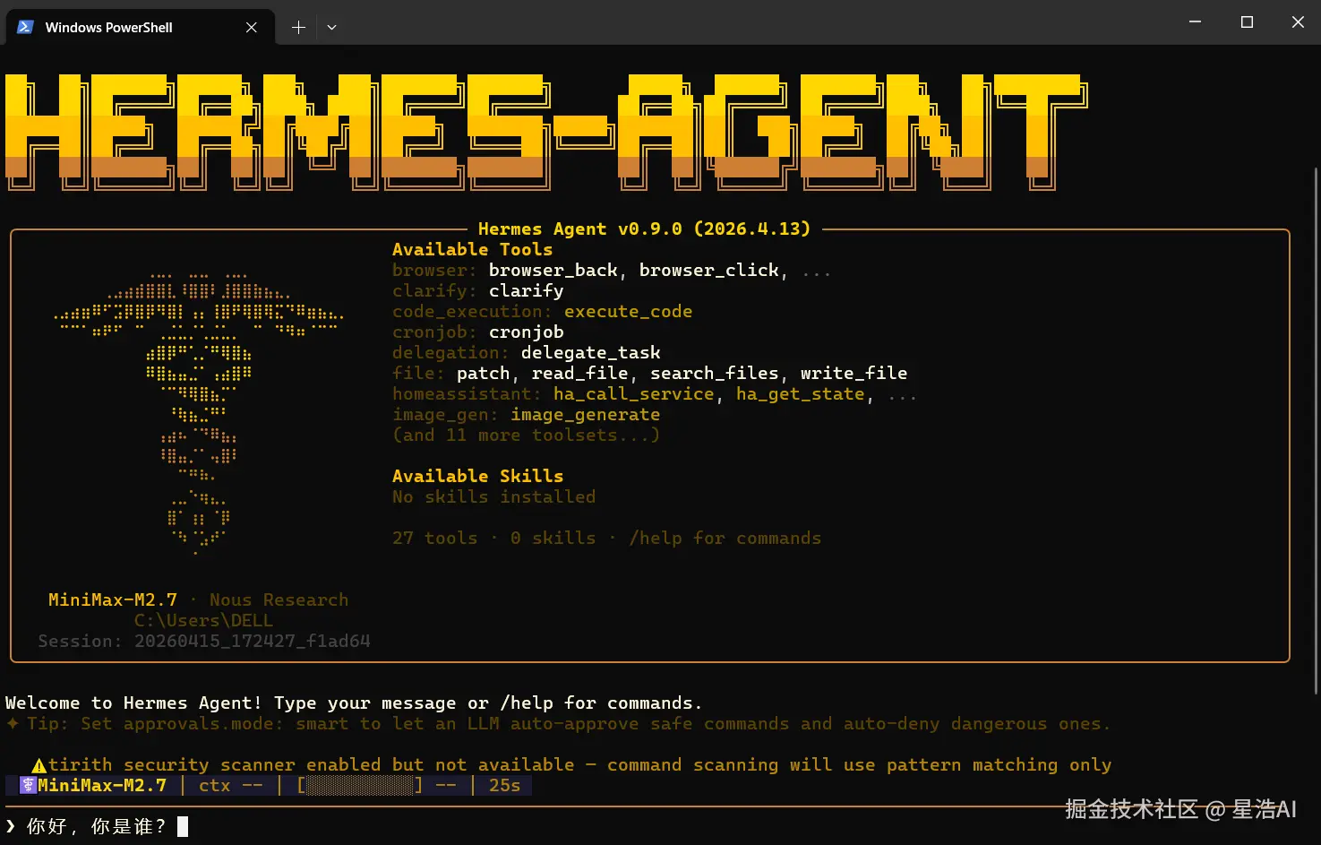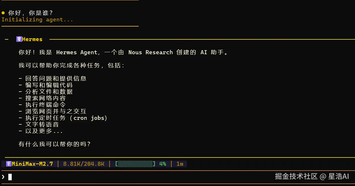 成功启动hermes chat,看到下面的欢迎界面,恭喜你安装成功了。