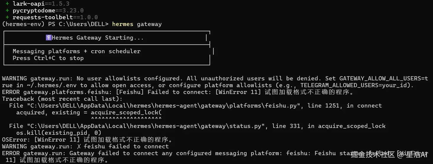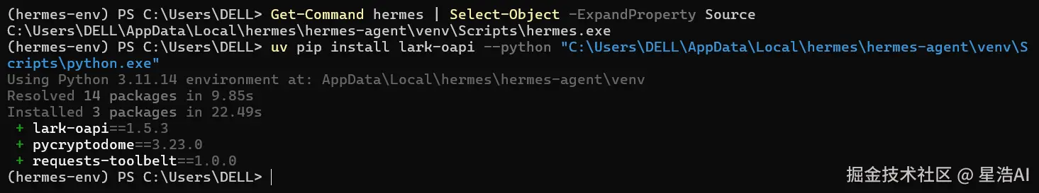 Hermes Gateway 运行在 hermes-agent/venv 虚拟环境中,因此,需要将飞书的lark-oapi安装到 hermes-agent/venv虚拟环境中。