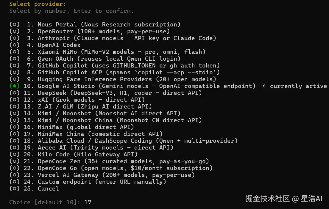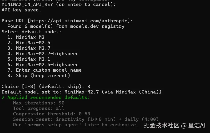 Hermes Agent 支持 OpenAI 兼容格式,国产模型只需配置 API 地址和 Key 即可使用。