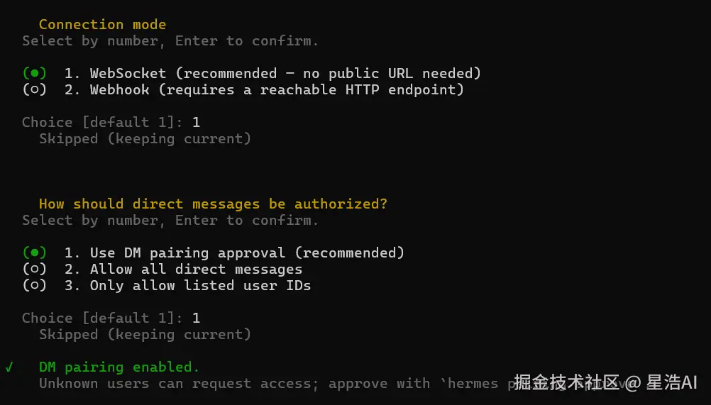 连接方式 : 默认选择 websocket。 谁有资格给你的 Hermes 发送私信(DM)? : 我选择:Use DM pairing approval (recommended) ------ 配对验证模式