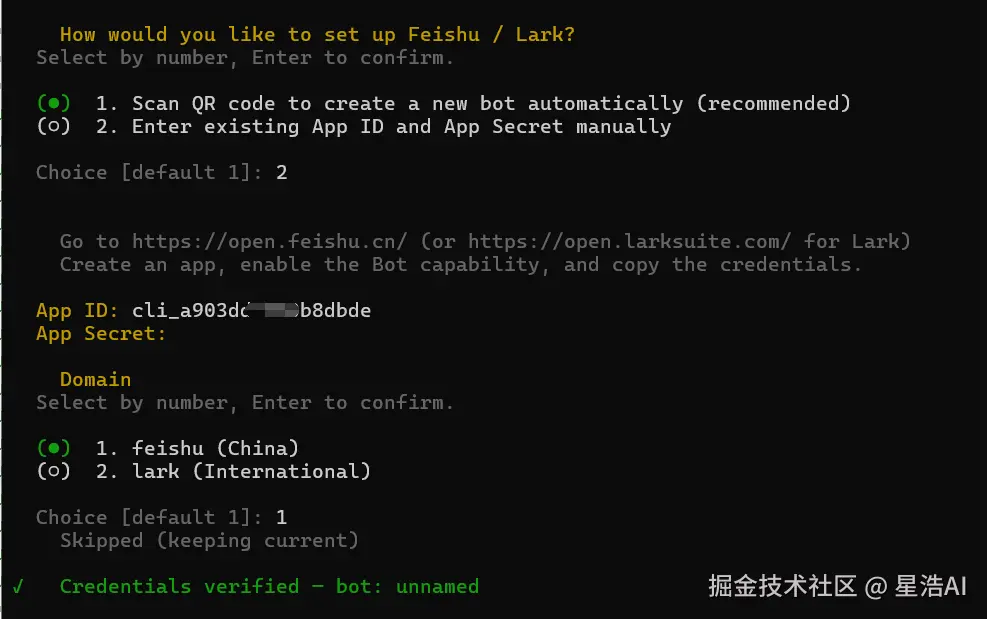 填入飞书应用的 App ID 和 App Secret。来源选 feishu (国内版,lark是海外版)