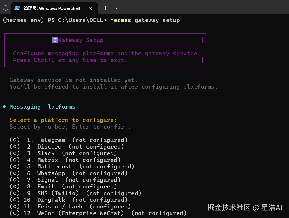 运行 hermes gateway命令,启动网关。
