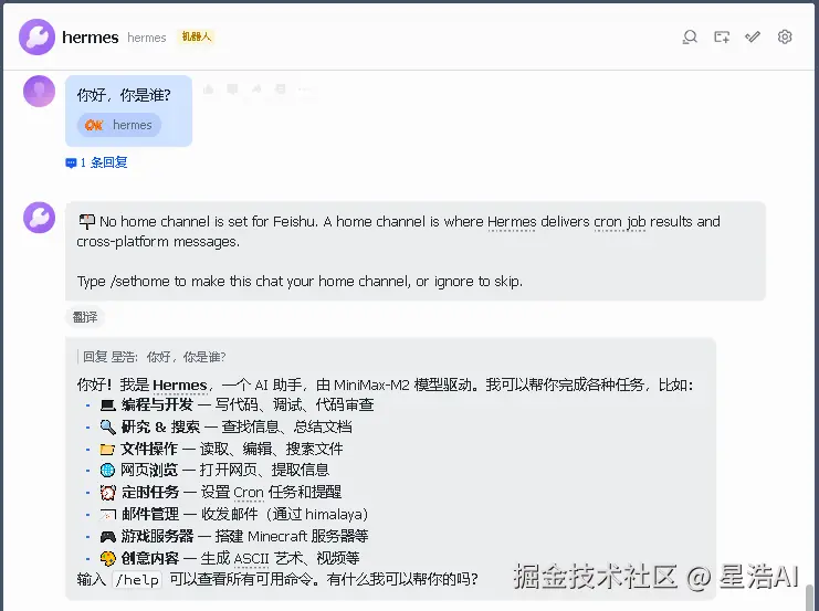 hermes Agent也给了回复,飞书中死活收不到消息。