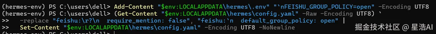 Add-Content "$env:LOCALAPPDATA\hermes\.env" "`nFEISHU_GROUP_POLICY=open" -Encoding UTF8