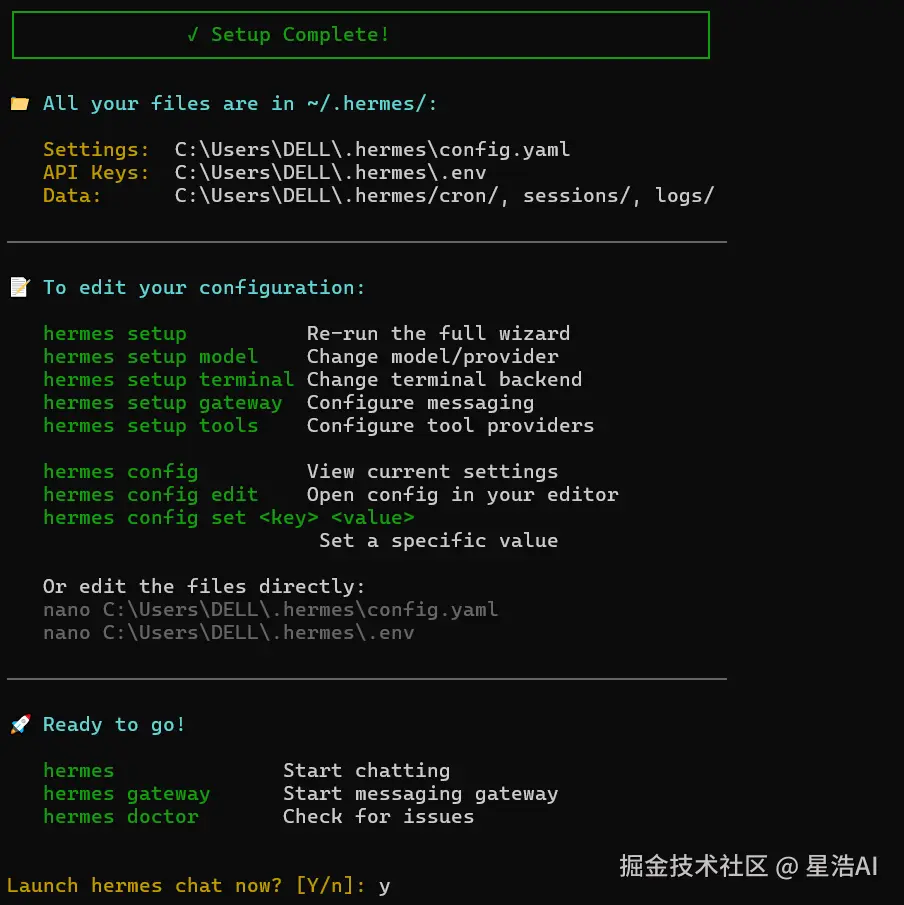 Launch hermes chat now ? 选择Y。