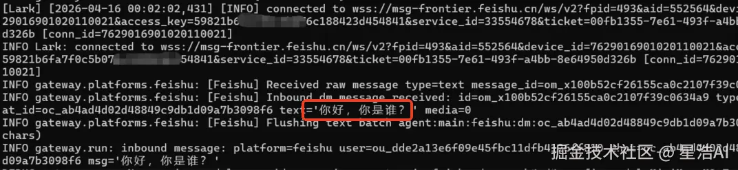 新版本不再有下面的问题,但在老版本中会出现:在飞书中发送消息,Hermes Agent 日志中显示接收到消息