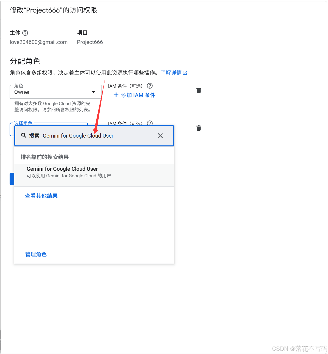 点击面板中间蓝色的 "+ 添加其他角色" 字样,在里面直接输入并搜索 Gemini for Google Cloud User。