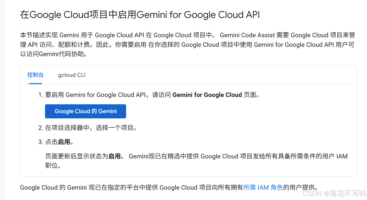 启动 api 链接: https://docs.cloud.google.com/gemini/docs/codeassist/set-up-gemini#enable-api