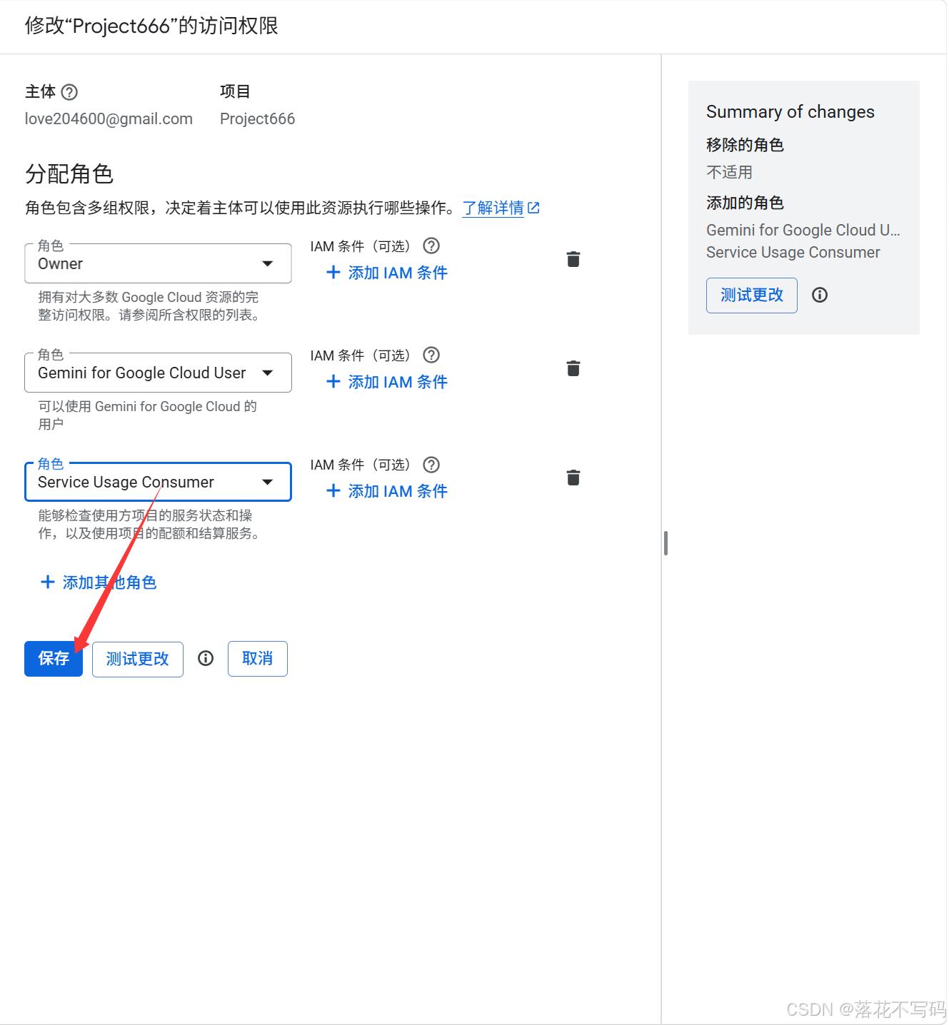 在新出现的一行选择框里,输入并搜索 Service Usage Consumer ,同样选中它,最后,保存