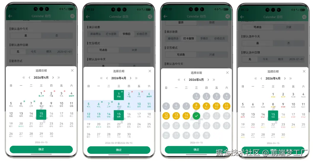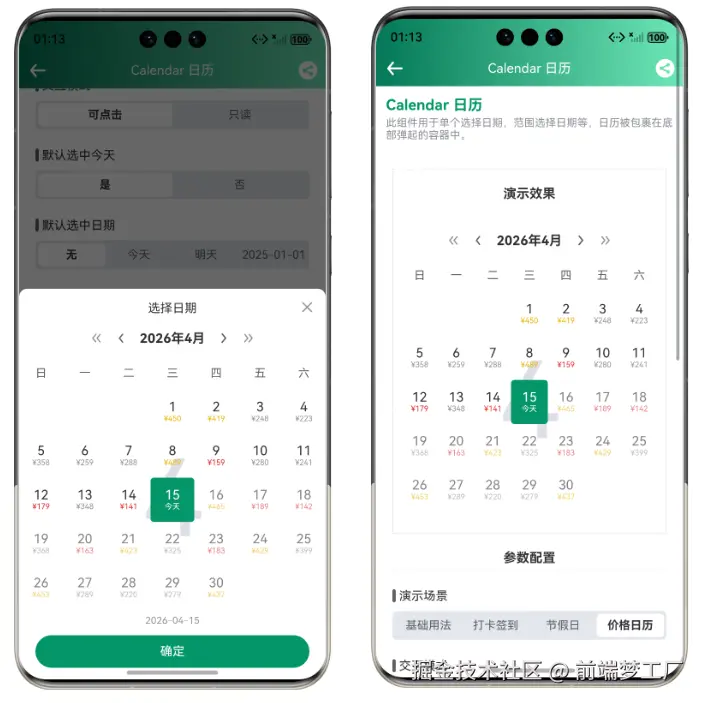 - ✅ 自定义日期内容插槽,适用于价格日历等场景