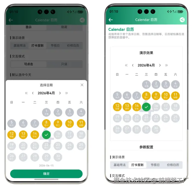 date插槽时会覆盖农历、节日等默认显示 - 打卡模式注意 :