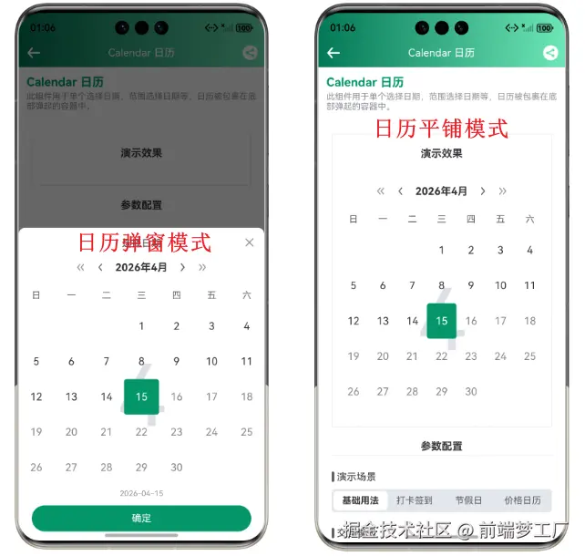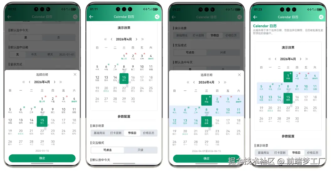 Calendar 组件内置了农历计算功能,开启后会自动显示农历日期。