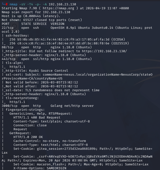/etc/hosts,将nexus.local指向该 IP,可能会触发不同的虚拟主机配置。 - 标题: "Kyubi Source Control",结合端口 3000,确认该服务器运行着源码管理系统。