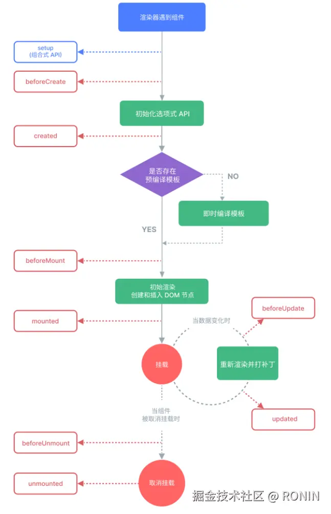 setup(组合式API) ->beforeCreate->created->beforeMount->mounted->beforeUpdate->updated->beforeUnmount->unmounted